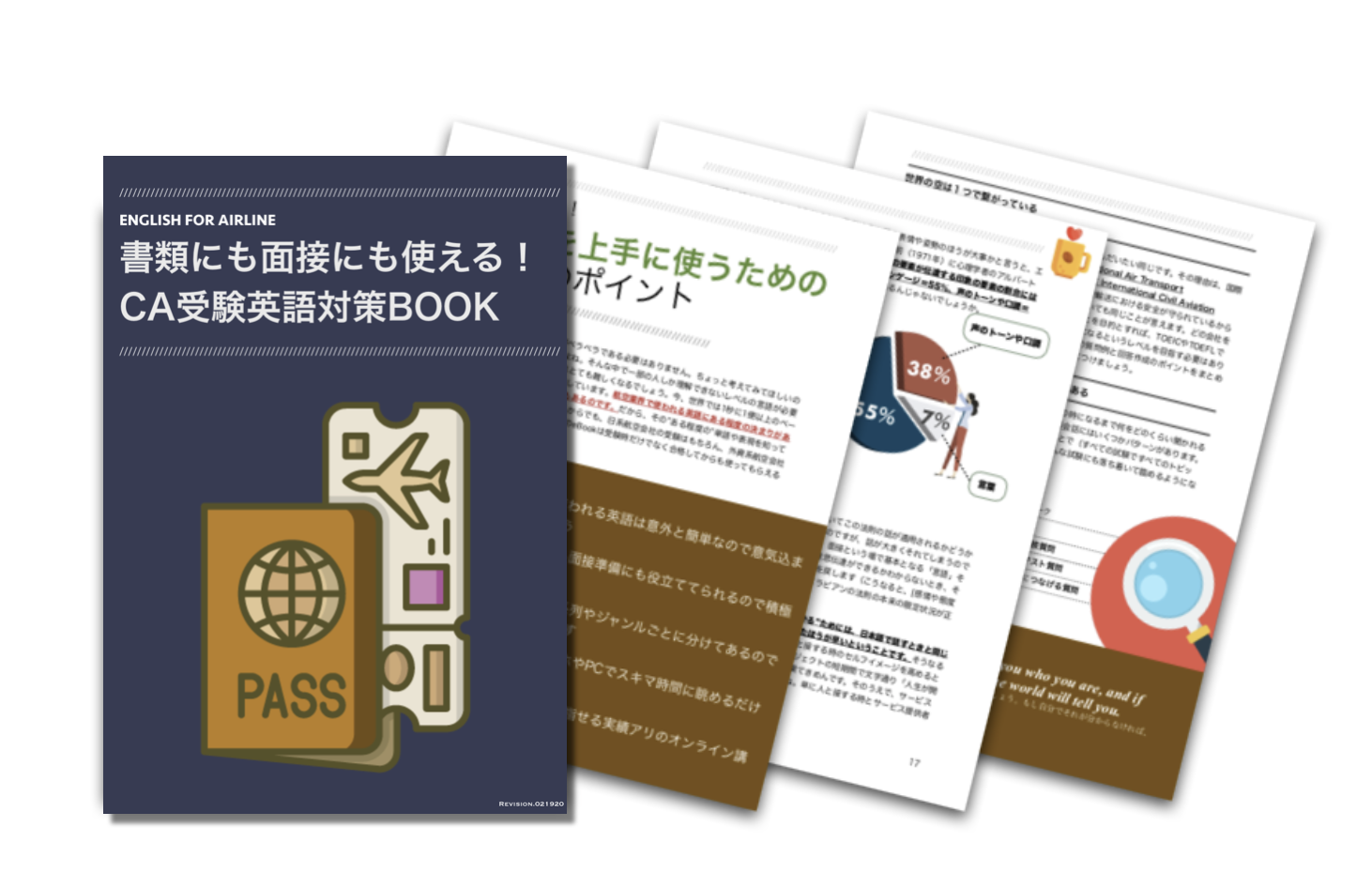 客室乗務員になるには、英語がペラペラである必要はありません。ちょっと考えてみてほしいのですが、地球の空は1つ―ですよね。そんな中で一部の人しか理解できないレベルの言語が必要だとしたら、空の安全を保つのはとても難しくなるでしょう。今、世界では1秒に1便以上のペースで飛行機がどこかの空港を出発しています。航空業界で使われる英語にある程度の決まりがあるのは「わかりやすさ」のためでもあるのです。だから、その”ある程度の”単語や表現を知っておくことで、英語が話せないところからでも、日系航空会社の受験はもちろん、外資系航空会社の受験にも対応可能になります。このeBookは受験時だけでなく合格してからも使ってもらえることを想定して作りました。